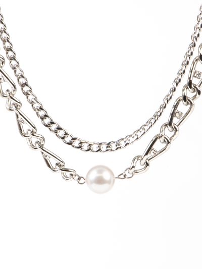 Collier court maxi 2 rangs chaînes à gros maillons avec grosse perle blanche et mini cristaux placage nickel et inox Margot 3 glamour automne 2024 Kara Bijoux-1