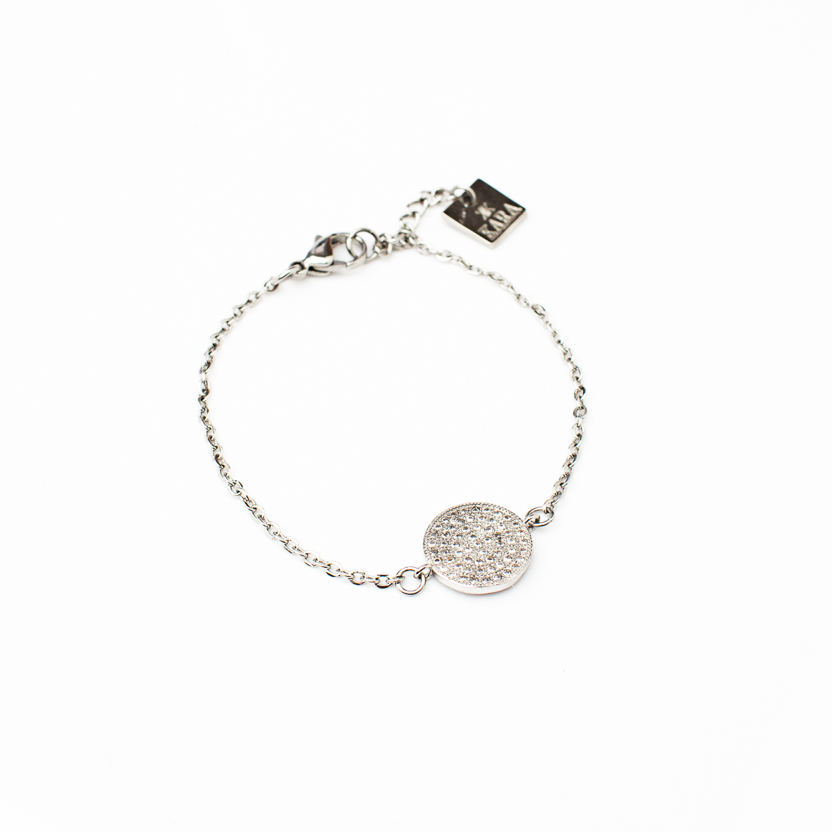 Acier inoxydable, connecteur de forme ronde (placage rhodium) de ton nickel avec cristaux, placage de ton nickel (breloque Kara).