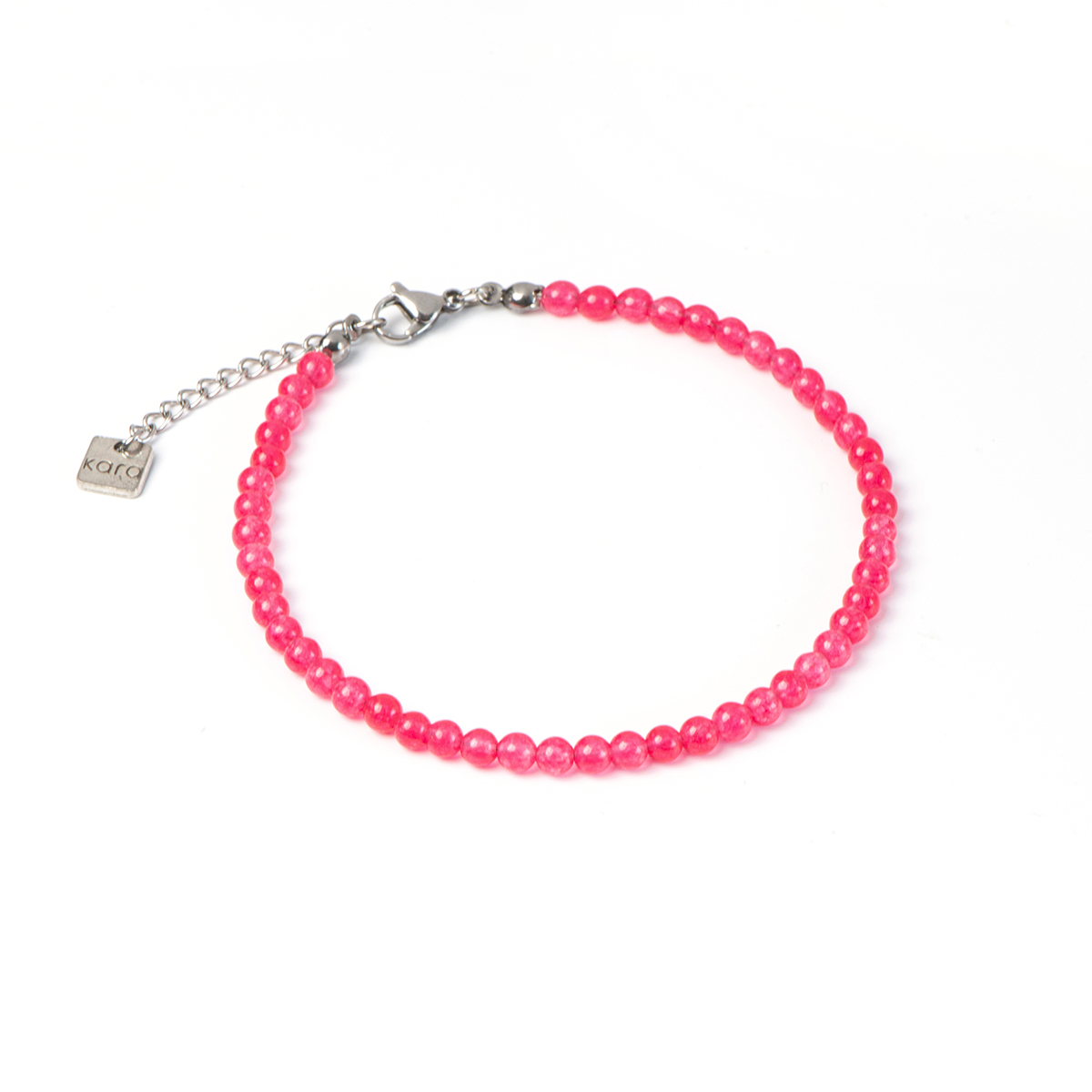 Acier inoxydable, billes semi-précieuses (jade) de couleur rose de forme ronde (4 mm), placage de ton nickel (breloque Kara).