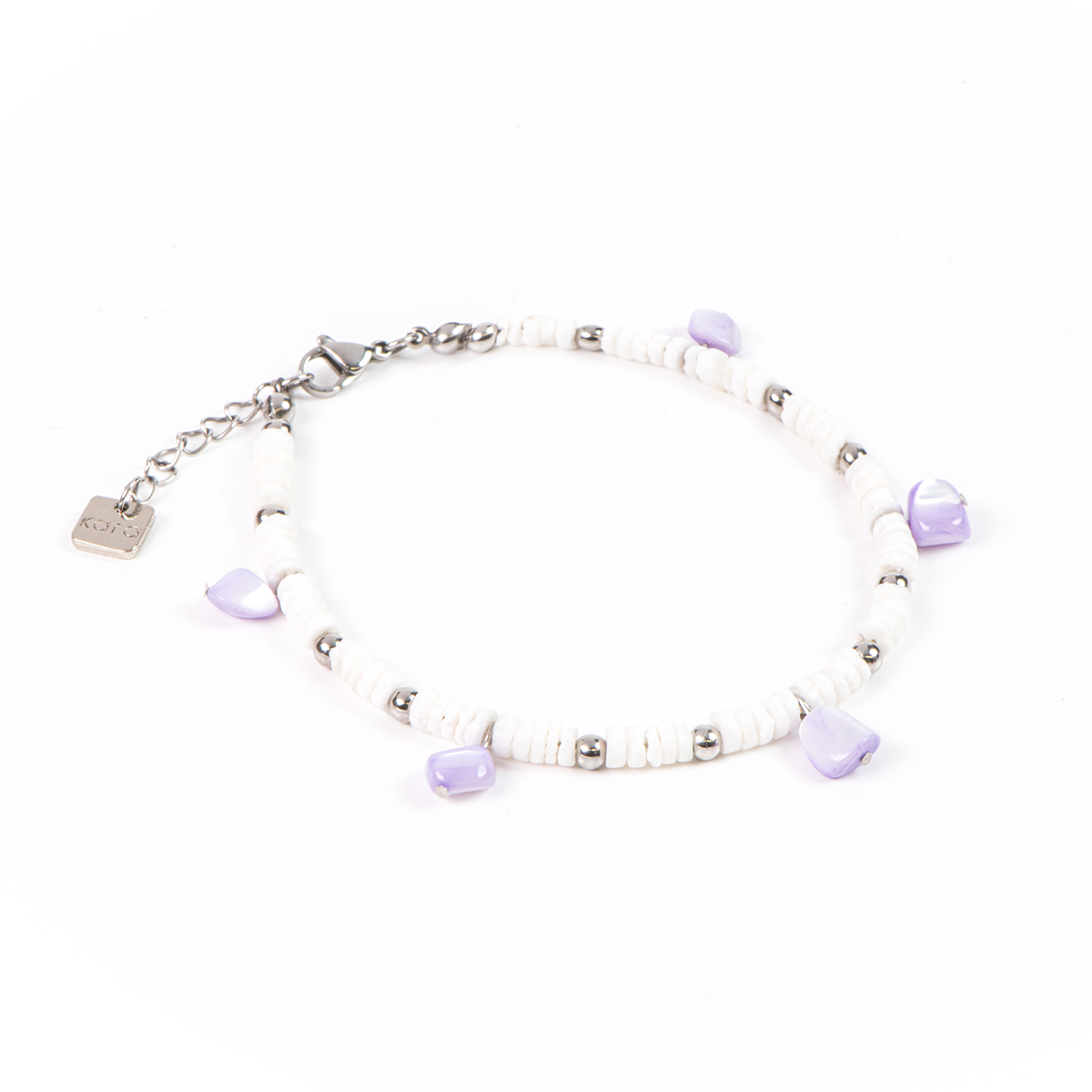Acier inoxydable (finition), rondelles de coquillage blanches (env. 5 mm), billes rondes inox (4 mm), perles de coquillage de forme et grosseur irrégulière teintées de couleur mauve pâle*.