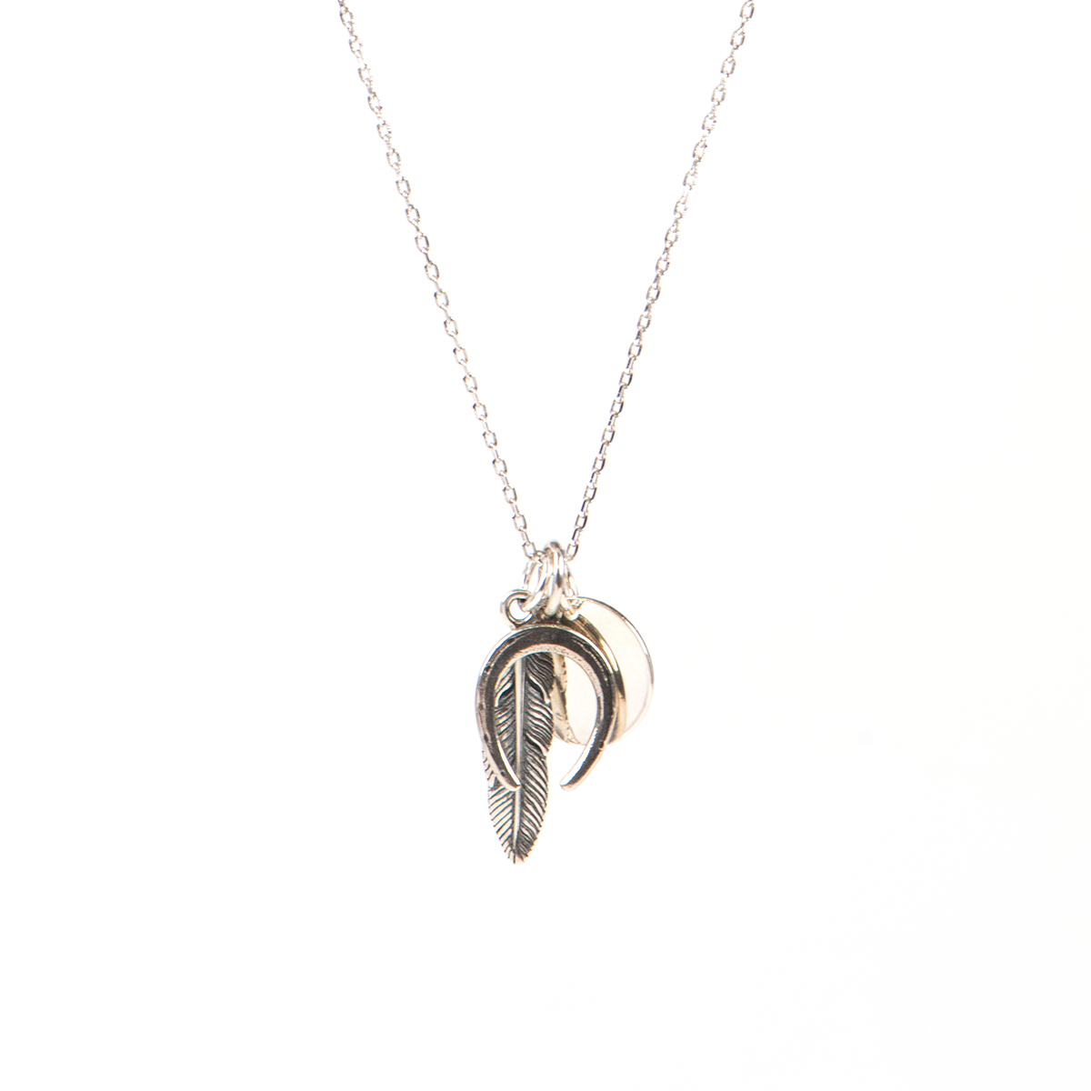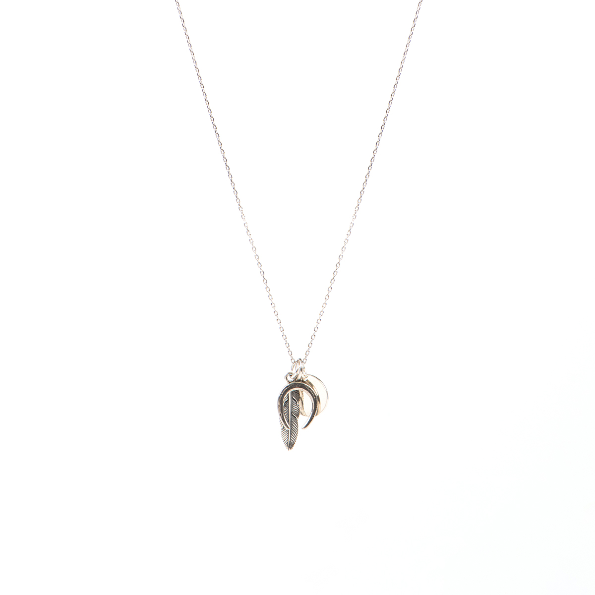 Argent sterling .925 (fini rhodium sauf le médaillon), acier inoxydable (finition), pendentif plume fini oxydé (21 mm), pendentif fer à cheval fini oxydé (15 mm), médaillon rond lisse (12 mm), chaîne cable mailles délicates ovales, placage de ton nickel (breloque Kara).
