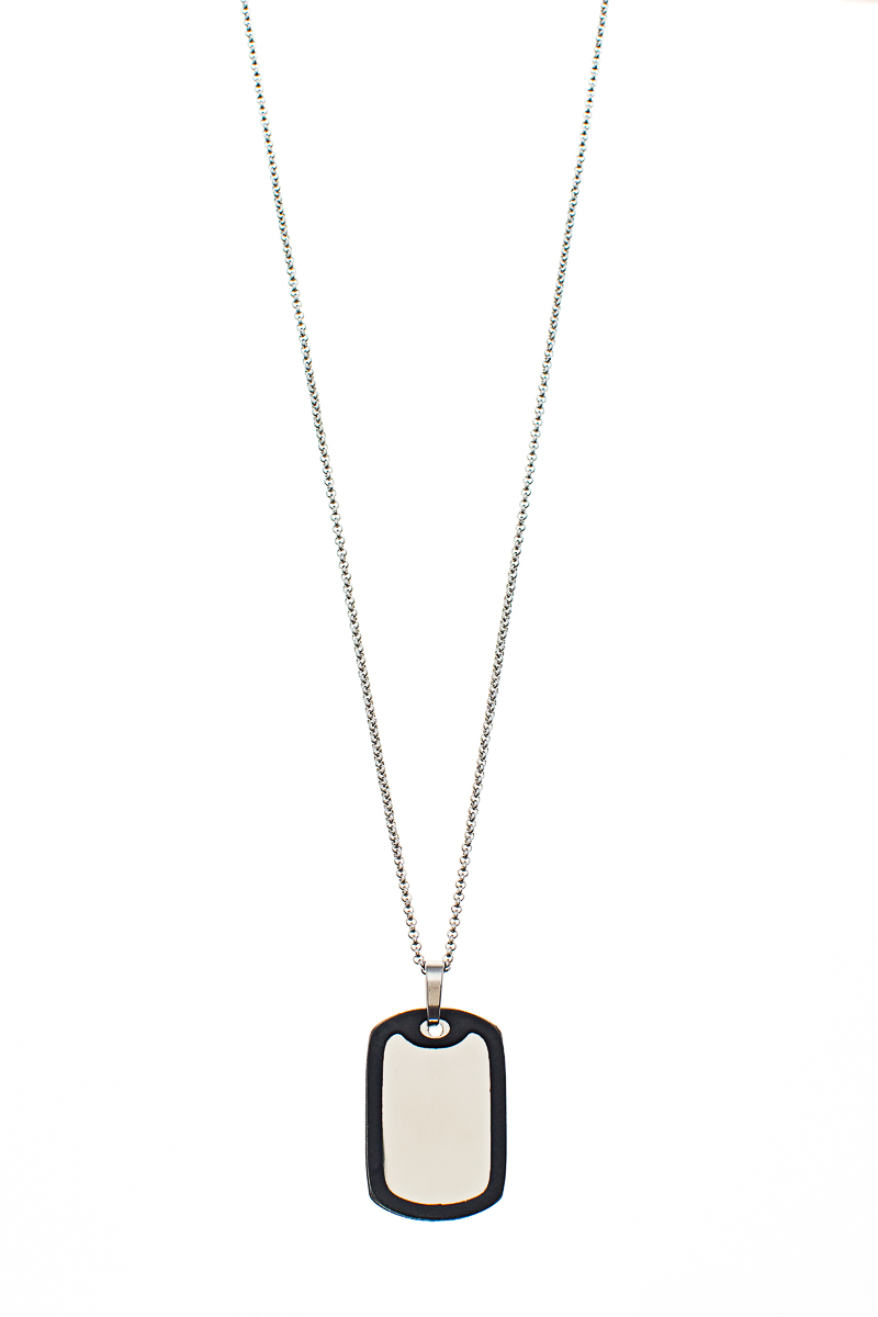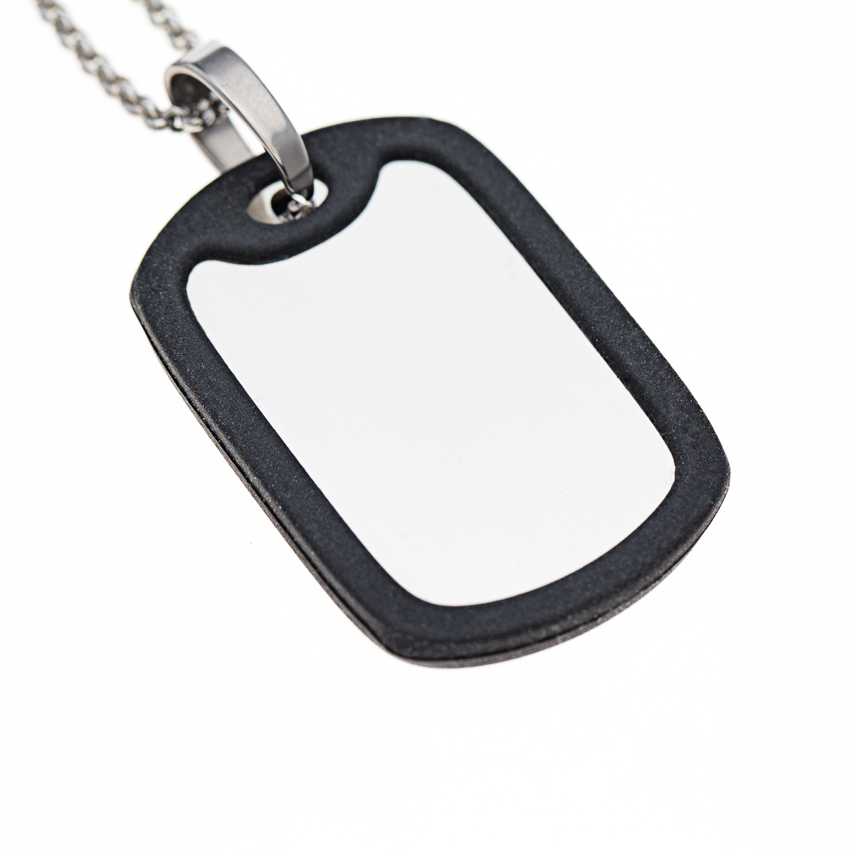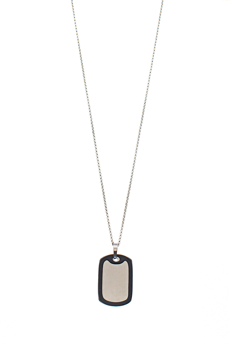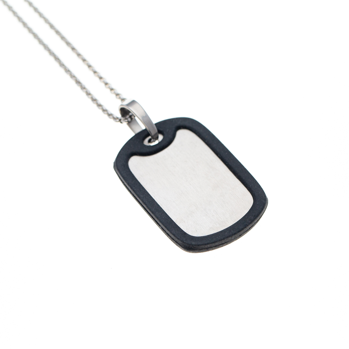 Acier inoxydable (chaîne + bélière + pendentif), caoutchouc de couleur noir (contour du pendentif – dog tag). Le pendentif à un côté brossé et un côté luisant.