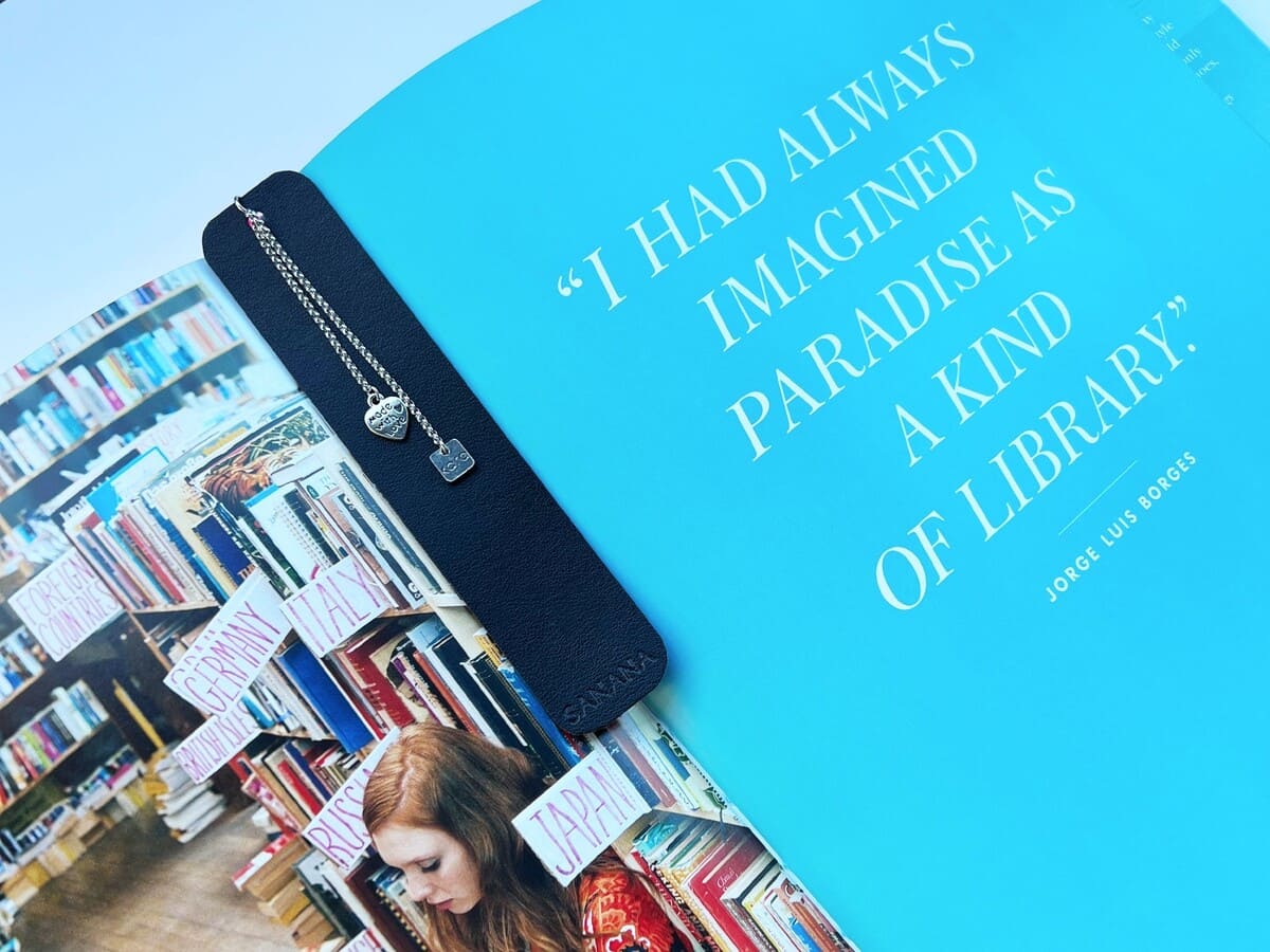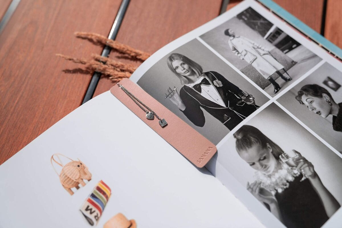 Ce joli signet, alliant cuir végétal et bijoux, offre une touche originale.